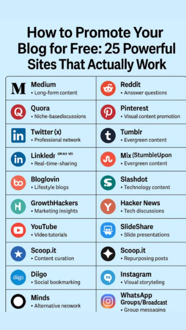 Promoting your blog doesn’t have to cost a dime! There are powerful platforms where you can share content, drive traffic, and grow your audience — all for free. Start with high-traffic content sites like Medium, LinkedIn Articles, and Quora to build visibility and authority. Use Reddit and Tumblr for special promotions. Social bookmarking sites like Flipboard, Mix, and Scoop.it help with viral reach.